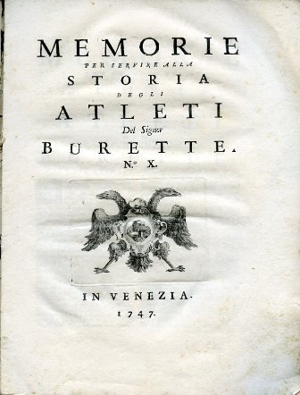 In-4° (255x193mm), pp. 34, brossura decorata coeva a motivi ornamentali intrecciati impressi in bianco su fondo arancio. Vignetta calcografica al titolo con aquila bicipite. Capilettera ornati, testo bicolonne. In barbe e a pieni margini, con usuali fioriture, in bello stato. Prima edizione italiana di un'importante dissertazione sulla storia dell'atletica e delle competizioni sportive presso i popoli antichi, originariamente pubblicata nelle Memorie dell'Accademia delle Iscrizioni di Parigi. Pierre Jean Burette (Parigi, 1665-ivi, 1747) fu professore di medicina al Collège de France, censore reale, collaboratore del 'Journal des Savants' e membro dell'Accademia delle Iscrizioni. Fu autore di numerosi testi d'argomento sportivo, relativi in particolare all'agonismo e all'atletica presso i popoli antichi oltre che di scritti sulla musica antica (la sua iniziale formazione era stata di musicista e a lui si debbono tra l'altro delle trascrizioni per clavicembalo delle ouvertures delle opere di Lulli). Bibliografia Sportiva Nazionale, p. 8. Cioranescu, I, p. 426.