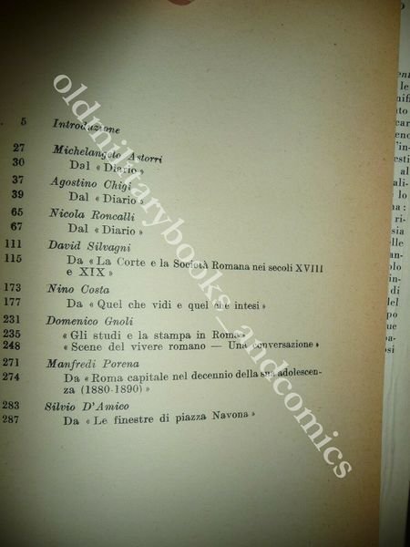 "DESCRIZIONE: Cappelli Bologna 1963, br. ed. t.t. con sovracc. ill. pp. 292 in 8°. Sommario: Michelangelo Astorri: Dal "Diario"; Agostino Chigi: Dal "Diario"; Nicola Roncalli: Dal "Diario"; David Sivagni: Da "La Corte e la società romana nei sec. XVIII e XIX; Nino Costa: Da "Quel che vidi e quel che intesi"; Domenico Gnoli: Gli studi e la stampa in Roma - Scene del vivere romano: una conversazione; Manfredi Porena: Da "Roma capitale nel decennio della sua adolescenza (1880 - 90)"; Silvio d'Amico: Da "Le finestre da piazza Navona". CONDIZIONI: Buone, sovracc. con strappetti e segni di sporco. PESO / WEIGHT: 500 gr. without package"