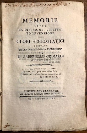 Memorie sopra la direzione, utilità, ed invenzione dei globi aereostatici recitate nella R. Accademia fiorentina da D. Gabbriello Grimaldi olivetano
