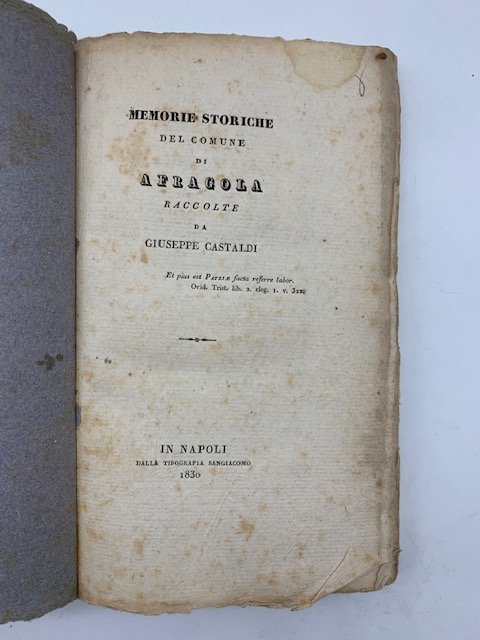 In 8 (cm 13 x 22), pp. 153 + (3) (le prime 6 pagine numerate in romani). Brossura rifatta con carta d'epoca. Poco comune saggio sulla cittadina campana di Afragola. Contiene anche notizie storiche-genealogiche delle famiglie illustri. Colaneri, "Bibliografia araldica", 348. Platneriana, p. 33. Manzoni, "Bibliografia statutaria e storica italiana", vol. 2, p. 21. Lozzi, p. 109.
