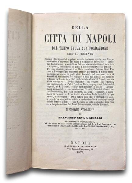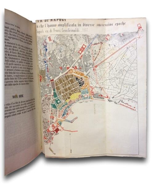 Bel volume in mezza pelle verde con fregi e titolo oro al dorso, pp 806 + 68, tavola a colori ripiegata della cittˆ di Napoli. All'interno pagine pulite e chiare, volume privo di fori e percorsi di tarlo. Difetto alla prima pagina con taglio asportato, segno di nastro adesivo sulla tavola della cittˆ. Esemplare molto buono