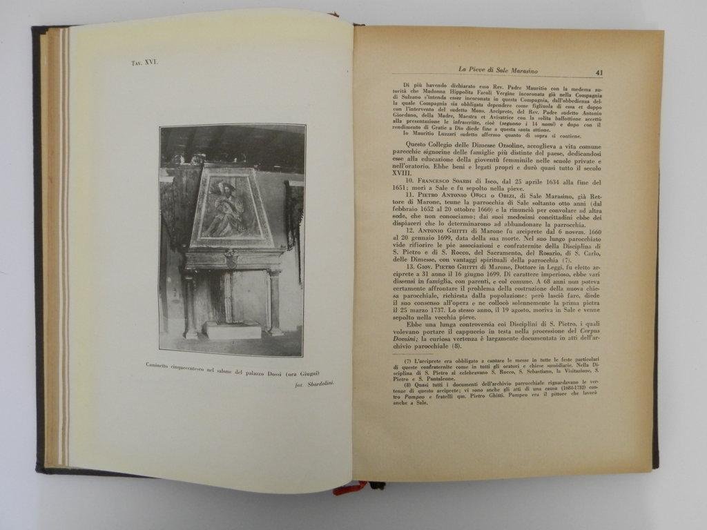 25 cm, pp. 294, 34 tavole fuori testo su 36, vecchi appunti a penna a 3 pagine, rilegatura coeva in mezza pelle abrasa, titolo in oro al dorso, piatti in tela. Esemplare nell'assieme buono. Tra gli articoli: La pieve di Sale-Marasino, Il carteggio Bellotti-Fantoni per le opere d'arte di Zone e di Cerveno. Don Luigi Schivardi nelle memorie di un alunno del suo oratorio. La parrocchia di Nozza, Storia di Bornato, Trittico Gardonese, una silloge inedita di iscrizioni metriche latine nel territorio bresciano . *** TUTTI I NOSTRI LIBRI SONO VISIBILI PREVIO CONTATTO MAIL O TELEFONO NELLA NUOVA SEDE DI MILANO: LIBRERIA COSMOPOLIS, VIA JOMMELLI, 22. ***