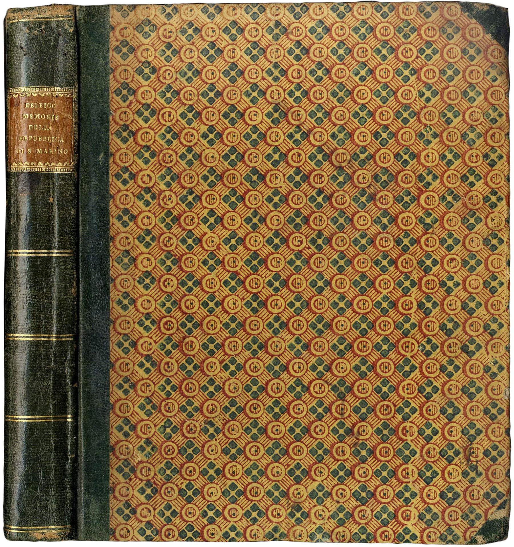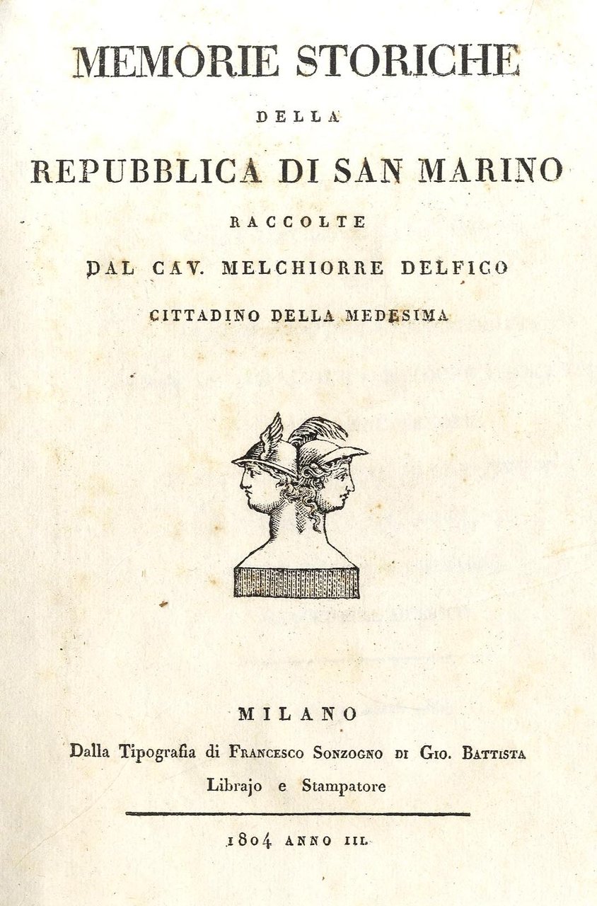 >in-4, pp. 264, LXXVI, (mancano 2 ff. in fine), legatura coeva in mezza pelle verde e angoli, tassello con titolo i oro al dorso, tagli rossi. Edizione originale di questa opera storica composta dal Melchiorre Delfico, filosofo e uomo politico abruzzese (1744-1835), durante il suo esilio a San Marino. Si tratta di un raro e approfondito studio sulla corografia e la storia di San Marino, dalle origini, alle prime attestazioni documentarie dell'XI secolo, fino all'analisi della forma di governo del primo ottocento. Fresco esemplare a grandi margini; in fine aggiunti 4 ff. di iscrizioni realizzate a Rimini, fatte stampare per il Papa da Luigi Belmonti a Rimini da Marsoner e Grandi nel 1814. Ottimo esemplare, fresco e marginoso. Lozzi 4728.