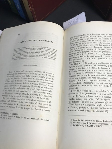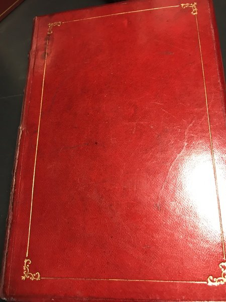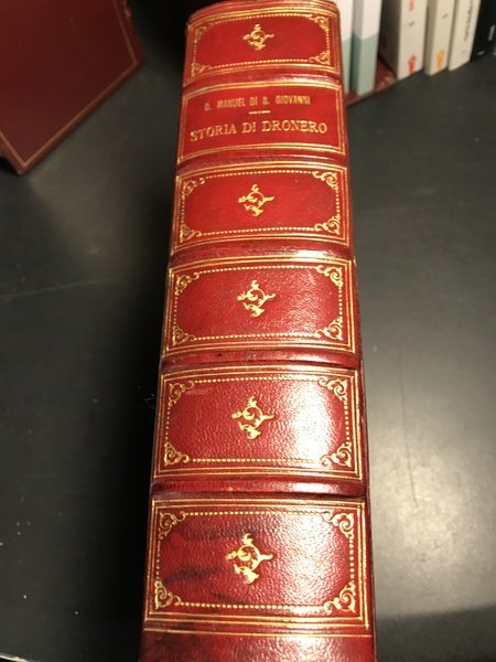 Tre voll. legati in uno parte prima pp. 288; parte seconda 324; parte terza 318 con antiporta una carta della Valle Maira p.v.r.; una tav. genealogica f.t. dei Berardi di San Damiano p.v.r. Elegante e solida legatura coeva in pieno vitellino rosso con unghie dei piatti incise con cornice a secco, altra cornice ai piatti con filetto e fregi agli angoli in oro; dorso 5 nervi con comparti riquadrati con listelli e fregi in oro, scritta autore e titolo in oro. Piccolo restauro alla carta topografica, e abile restauro ad un tratto della cerniera del piatto ant. Bellissimo esemplare di questa opera, oramai divenuta molto rara, di Giuseppe Manuel di San Giovanni (1810 – 1886), saggista, scrittore italiano, il più noto ed appassionato storico di Dronero e della Valle Maira. ( Manno III 20286)