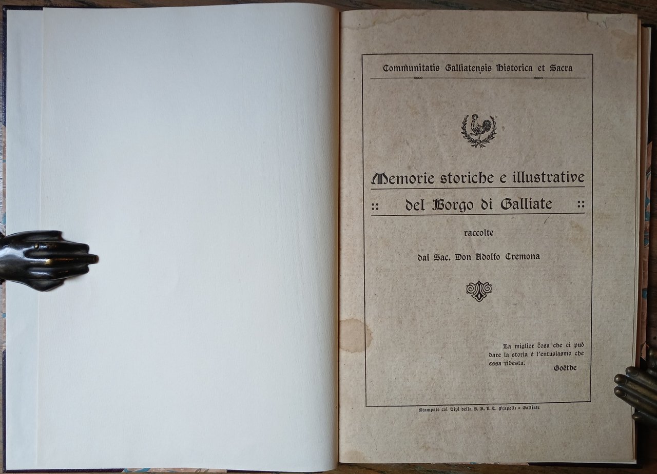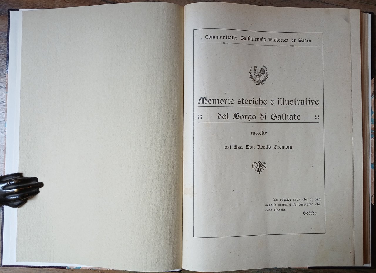 In testa al frontespizio : "Communitatis Galliatensis Historica e Sacra". In 8°, legatura in mezza pelle marrone scuro con punte, dorso a 5 nervi con titoli impressi in oro, carta marmorizzata ai piatti, conservate le copertine della brossura editoriale, pp. 204,(2),(10 di pubblicità commerciale), con 14 illustrazioni nel testo di cui 9 a piena pagina. In testa al frontespizio : "Communitatis Galliatensis Historica e Sacra". Ottimo stato di conservazione. Edizione originale.