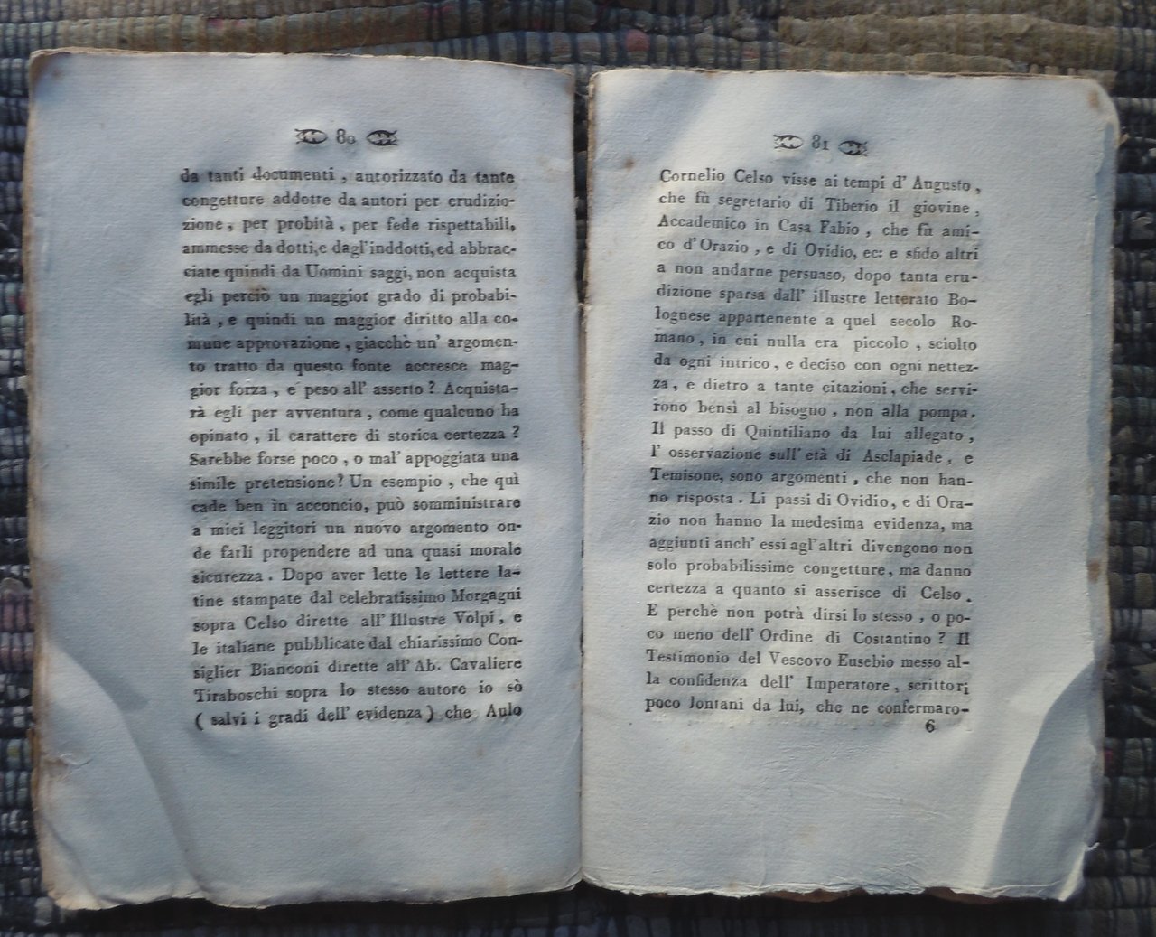 In Bologna, nella Stamperia di Jacopo Marsigli; 1812 al frontespizio; da rilegare, cucitura a spago centrale, copertina in carta azzurrina, in 8°, pp. VIII-174. A fine volume tavola con croce aurata. Aloni ai margini delle prime pagine, testo intatto. Pagine lievemente ondulate. Su carta forte. Imprimatur in data 5 novembre 1817 all'ultima carta.