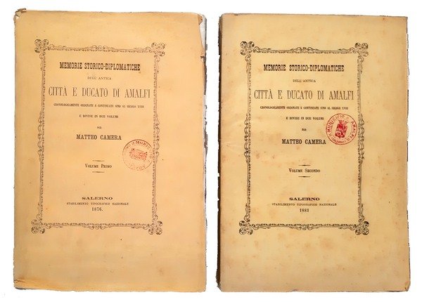 Due volumi, 300x200 mm, leg. editoriale in brossura, con titolo incorniciato ai piatti anteriori e titolo ai dorsi; pp. 682, (2); 710, LXVIII, (2), [1] c. di tav.; il secondo volume è stato pubblicato nel 1881. Testo su due colonne. Tavola fuori testo nel secondo volume (p. 324-325), con illustrazione di un Sarcofago marmoreo della Chiesa di S. Giovanni del Toro a Ravello, dis. di Matteo Camera e inc. di G. Fusaro. Interessante e poco comune opera di alto valore storico-diplomatico relativa ad Amalfi e alle località della costiera amalfitana. Prov.: Dedica manoscritta al frontespizio di entrambi i volumi ("A S.E. il Prefetto Carlo Manno per omaggio della Città di Amalfi - 12 ottobre 1936 - XVI - Il Podestà Salvatore Esposito"). Timbro tondo ad inchiostro rosso ("Municipio di Amalfi") al frontespizio e sulla copertina anteriore di entrambi i volumi. Rif.: IT\ICCU\SBL\0727385. OCLC, 603840271. Cond.: Segni d'uso alle legature (abrasioni e piccoli strappi alle carte delle copertine). Carte in barbe, parzialmente slegate, con occasionali fioriture. Esemplare in condizioni generali molto buone.