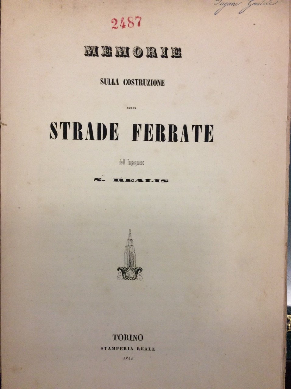 In-8 gr. (mm. 245 x 154), brossura originale (manc. al dorso e al piatto anter.), pp. 127, con 2 tavole litografiche fuori testo, più volte ripieg., ciascuna con numerose figg. relative a dettagli, piante, profili, sezioni, passaggi a livello, etc., delle strade ferrate di Parigi fino a Orléans, di Lille e di Valenciennes fino alla frontiera del Belgio. Vi sono trattati: De' motori e de' veicoli adoperati nelle strade ferrate -Teoria delle macchine locomotive - Delle pendenze e delle risvolte nelle strade ferrate - Della carreggiata - De' lavori di terra - Delle opere d'arte - Della compilazione de' progetti. Ben conservato.