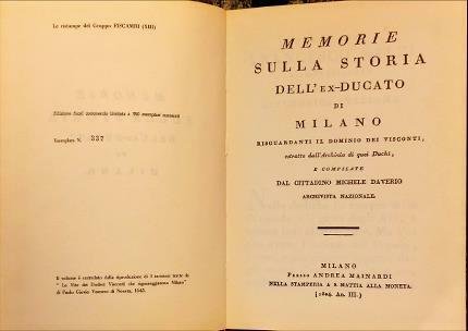 Memorie sulla storia dell’Ex-Ducato di Milano. Riguardanti il dominio dei Visconti estratte dall’Archivio di quei Duchi, e compilate dal cittadino Michele Daverio archivista nazionale.