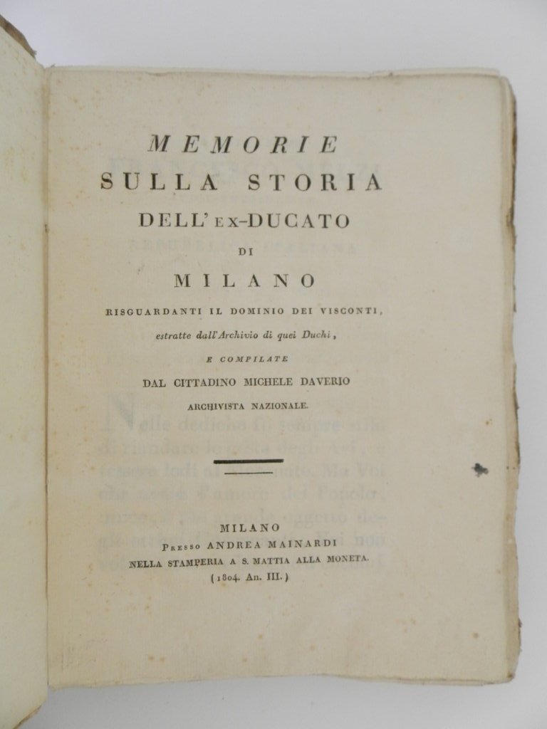 4°, pp. (28), 277, (1), rilegatura coeva in cartone rustico, titolo manoscritto al dorso. Prima edizione. «E' la prima parte dell'importante Storia del Daverio; la seconda riguardante il dominio degli Sforzeschi rimasta inedita e il ms. si conserva nella biblioteca di Brera» (Hoepli 662). Copertine con tracce d'uso e piccola mancanza al dorso, esemplare all'interno fresco e con barbe. . *** TUTTI I NOSTRI LIBRI SONO VISIBILI PREVIO CONTATTO MAIL O TELEFONO NELLA NUOVA SEDE DI MILANO: LIBRERIA COSMOPOLIS, VIA JOMMELLI, 22. ***