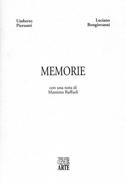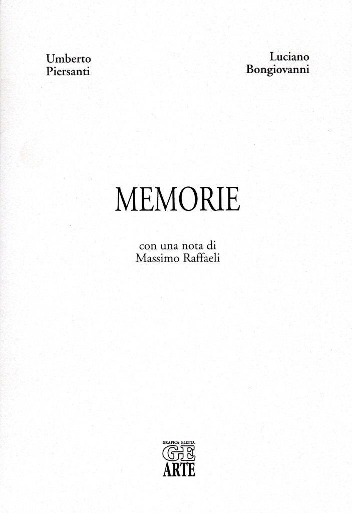 Memorie, prima edizione ottobre 2000, formata 18 x 26. <BR>Copertina morbida di colore bianco con titoli in nero al piatto anteriore e sul dorso. Questa edizione contiene due liriche inedite di Umberto Piersanti, due acqueforti - acquetinte di Luciano Bongiovanni e una nota di Massimo Raffaeli. Le incisioni sono tirate a mano con torchio a stella dall'artista. Tiratura limitata in 300 copie di cui le prime 125 contenenti le incisioni. Nostra copia n. 65. <BR>Ottime condizioni.