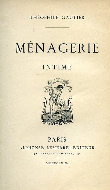 In-16°, pp. (4), 114, (6), legatura del tempo m. percallina verde con titolo oro al dorso e piatti marmorizzati policromi. Fregi tipografici arabescati. Perfetto stato. Prima edizione. Comprende: Temps Anciens; Dynastie Blanche; Dynastie Noire; Côté des Chiens; Caméléons, Lézards et Pies; Chevaux. Carteret, I, 334, Vicaire, III, 934. Clouzot, p. 73.