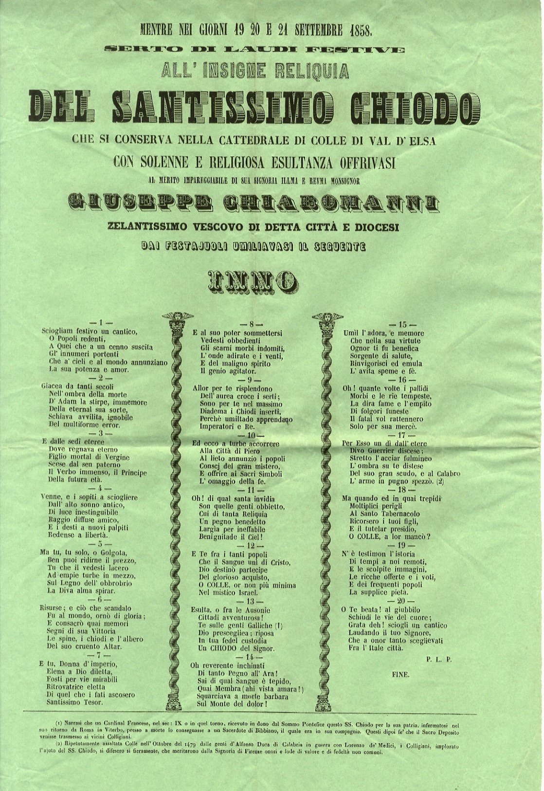 MENTRE nei giorni 19, 20 e 21 settembre 1858, serto di laudi festive all'insigne reliquia del Santissimo Chiodo che si conserva nella cattedrale di Colle di Val d'Elsa, con solenne e religiosa esultanza offrivasi, Giuseppe Chiaromanni zelantissimo vescovo di detta città e diocesi, dai festajuoli umiliavasi il seguente Inno [segue l'inno, impresso su tre colonne di testo, firmato in calce: P.L.P].