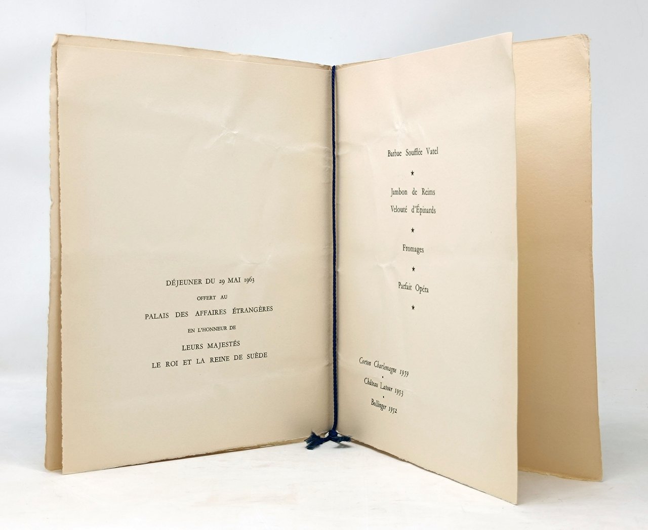 MENù Déjeuner en l'honeur de Leurs Majestés Le Roi et la Reine de Suède PALAIS DES AFFAIRES ETRANGERES 29 mai 1963