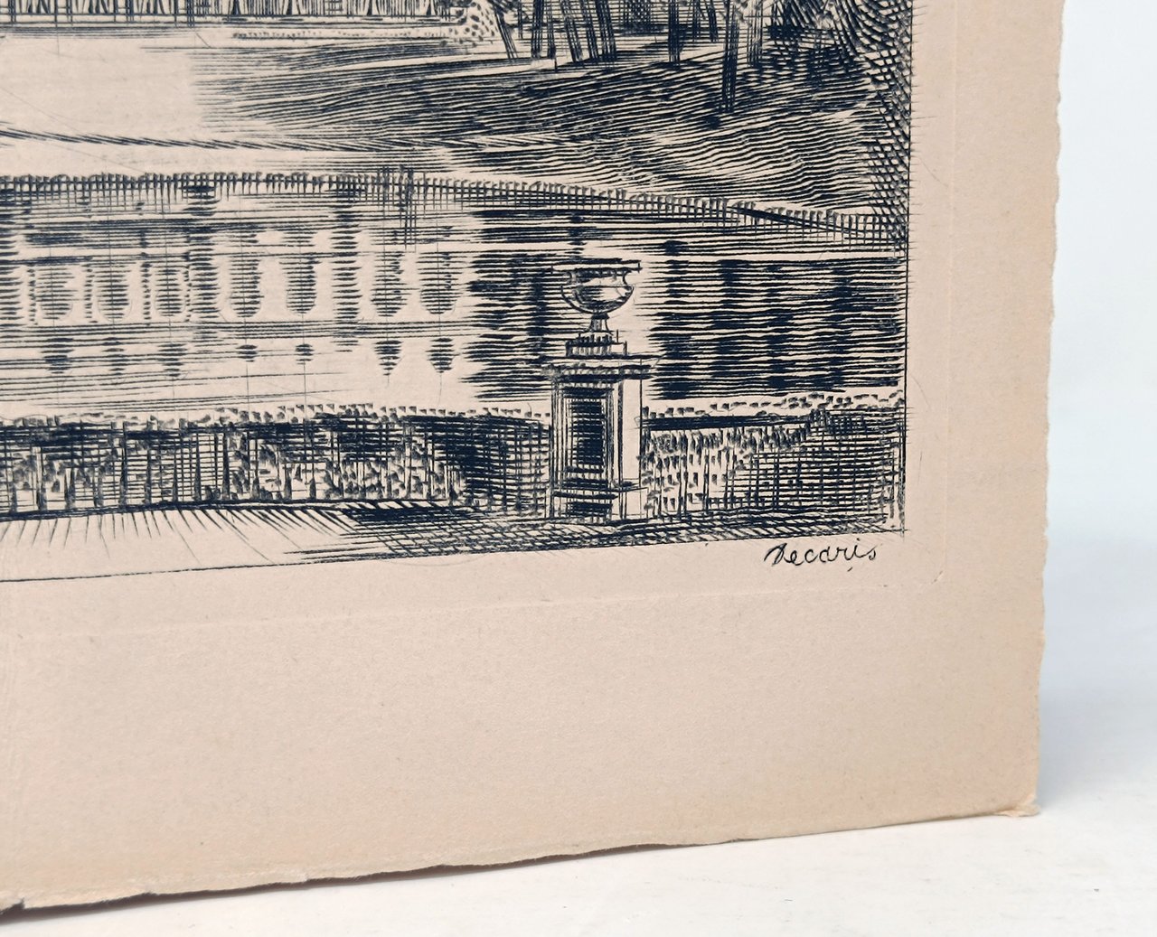 Copertina flessibile su carta spessa con una bella incisione originale, sul piatto anteriore, firmata in lastra dal celebre incisore francese Albert Decaris (1901 - 1988) raffigurante la facciata del Palazzo degli affari esteri a Parigi. Il Menù fa riferimento al pranzo offerto il 29 maggio 1963 in onore del re (Gustave VI Adolphe) e della regina (Louise) di Svezia in visita ufficiale in Francia. Il menù è composto da 4 pagine interne (su carta spessa) le due centrali con testo stampato. Il primo dei due fogli stampati è una sorta di frontespizio sul quale è riportato l'oggetto, la sede (Palais des affaires étrangères) e la data (29 mai 1963) della serata. La seconda pagina stampata propone il menù della serata con le portate e i vini. Le pagine interne sono unite alla copertina tramite un apposito ed elegante cordoncino in doppio colore: blu e giallo (i colori della bandiera svedese). Formato del menù: 23,5 x 27 cm circa. La battuta dell'incisione realizzata da Decaris misura 17 x 21 cm circa.; Stato di conservazione: qualche ammaccatura e piega trasversale sulla copertina, pagine interne un po' stropicciate. Leggermente sporco il margine inferiore del piatto anteriore. Due piccoli puntini incisi sul bordo destro verticale bianco della copertina anteriore. Nel complesso, comunque, abbastanza ben conservato. Si vedano le fotografie. Oggetto da collezione di estrema rarità sia come documento storico, sia per la magnifica incisione di uno dei grandi illustratori dell'epoca.