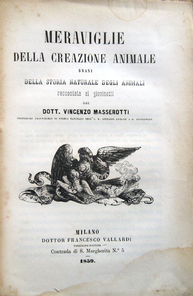 Meraviglie della creazione animale. Brani della storia naturale degli animali raccontata ai giovinetti dal Dott. Vincenzo Masserotti Professore provvisorio di Storia Naturale nell'I. R. Ginnasio Liceale a S. Alessandro