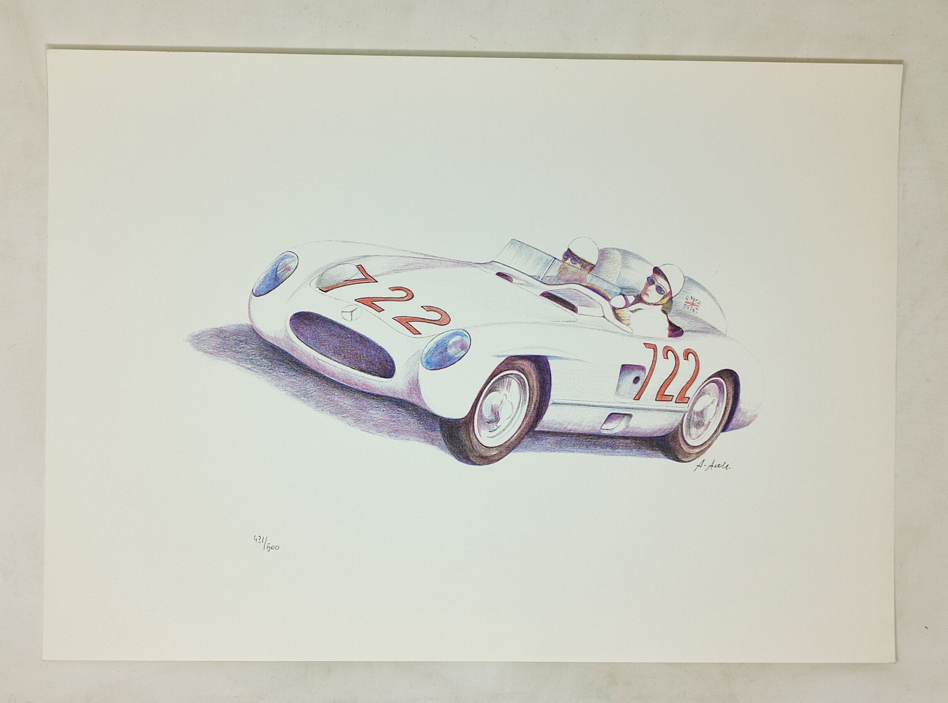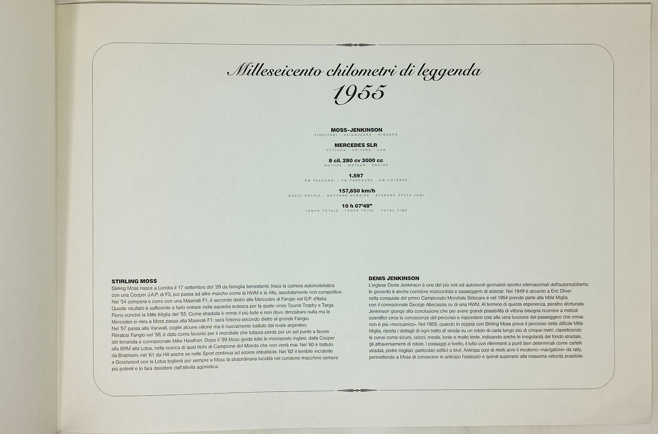 STAMPA ORIGINALE NUMERATA E FIRMATA (a matita). tiratura limitata a 500 copie. in un doppio foglio che funge da cartellina e' custodita (sciolta) una stampa, firmata e numerata, riproducente la MERCEDES SLR vincitrice delle Mille Miglia dell'anno 1955. su una facciata interna della 'cartellina' sono presenti, stampate, con il titolo 'milleseicento chilometri di leggenda 1955', le caratteristiche tecniche dell'auto e le notizie riguardanti la predetta corsa. in particolare, notevole spazio è dedicato alla biografia sportiva del pilota Stirling Moss e a quella dell'accompagnatore Denis Jenkinson (giornalista). la stampa in vendita e' firmata a matita dall'illustratore e porta il numero 431/500. dimensioni della stampa: 48 x 34 cm circa.stato di conservazione: ottimo. Di difficile remperimento.