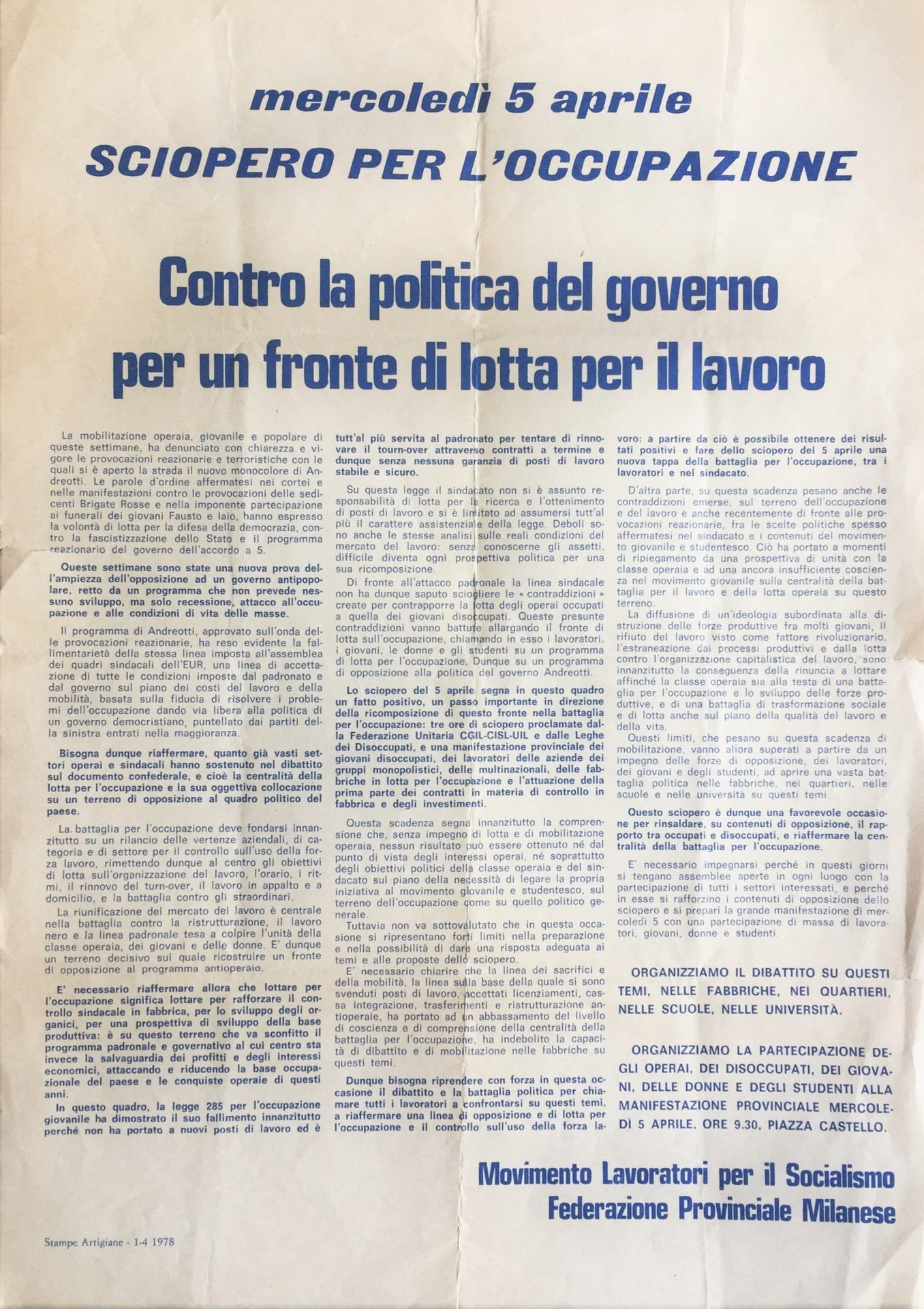 Volantone stampato al solo recto che promuove la manifestazione contro il governo Andreotti da tenersi a Milano in Piazza Castello, 3 piccoli strappi ai margini, altrimenti ottimo stato.