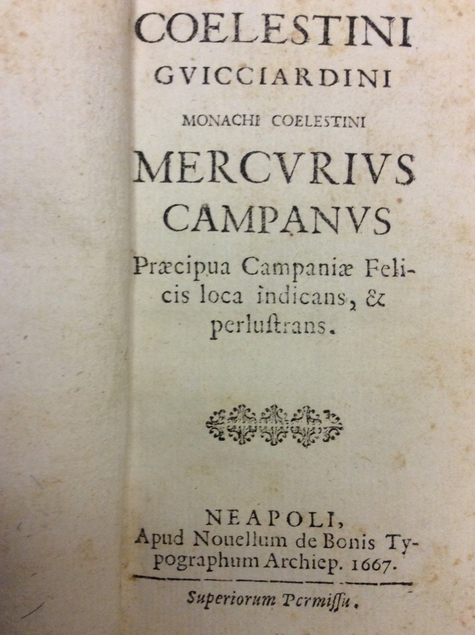 In-24 gr. (mm. 138x75), p. pergamena coeva, fregi e titolo oro al dorso, pp. (12),274. "Prima edizione". Cfr. Furchheim, p. 71 - Fera-Morlicchio,1883/1: Rarissima guida della Campania composta dal Superiore dei Cappuccini del Regno di Napoli - Sandomenico C. Leggere Capri, p. 247: Testo ripartito in 4 parti: Pars Mediterranea - Pars Litoralis - Urbis Neapolitana descriptio - Tractus Puteolanus, Baianus et Cumanus. Nella Pars Litoralis' breve cenno alla Caprearum Insulam, famosam Tiberij Caesaris inhabitatione'... Alc. carte uniformem. arrossate e qualche lieve fioritura, altrimenti esemplare ben conservato.