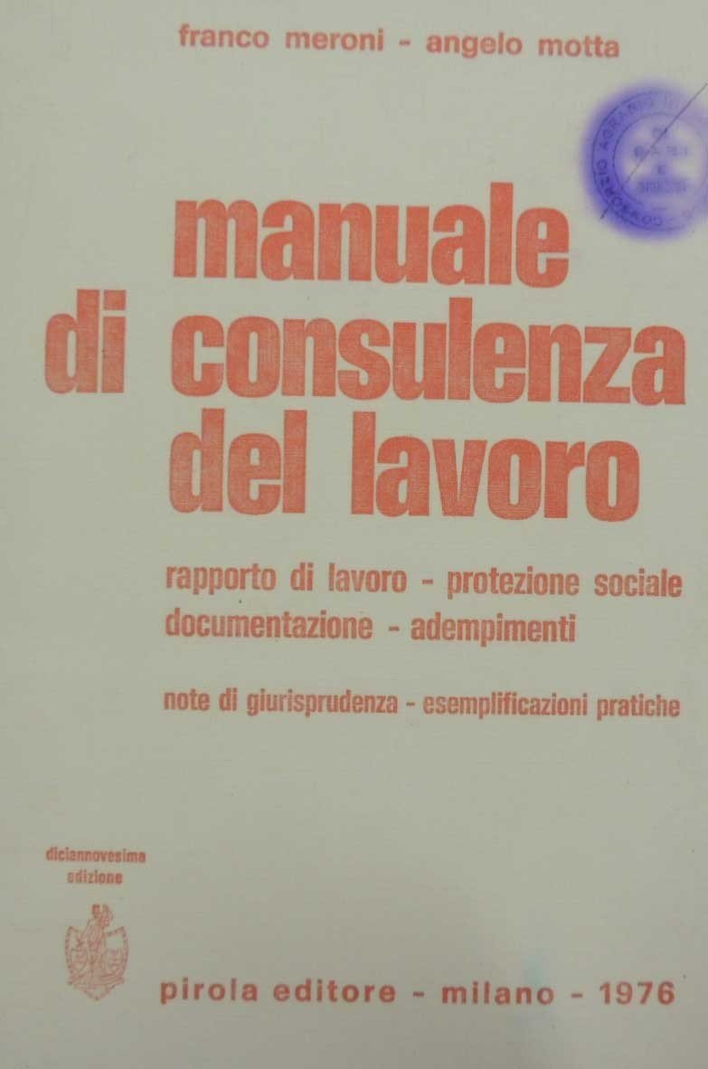 Franco Meroni, Angelo Motta, Manuale di consulenza del lavoro. Rapporto di lavoro, protezione sociale, documentazione, adempimenti. Note di giurisprudenza, esemplificazioni pratiche, Pirola Editore, Milano 1976, diciannovesima ed., pp. 694, pp. cm 24, br. ed. Descrizione effettuata sulla base della prima di copertina. Timbro di biblioteca estinta alla prima di copertina e alla prima carta di testo, piccola etichetta adesiva di rivenditore alla seconda di copertina. Minima ingiallitura della carta, sporadiche fioriture, qualche sgualcitura, per il resto buona copia.
