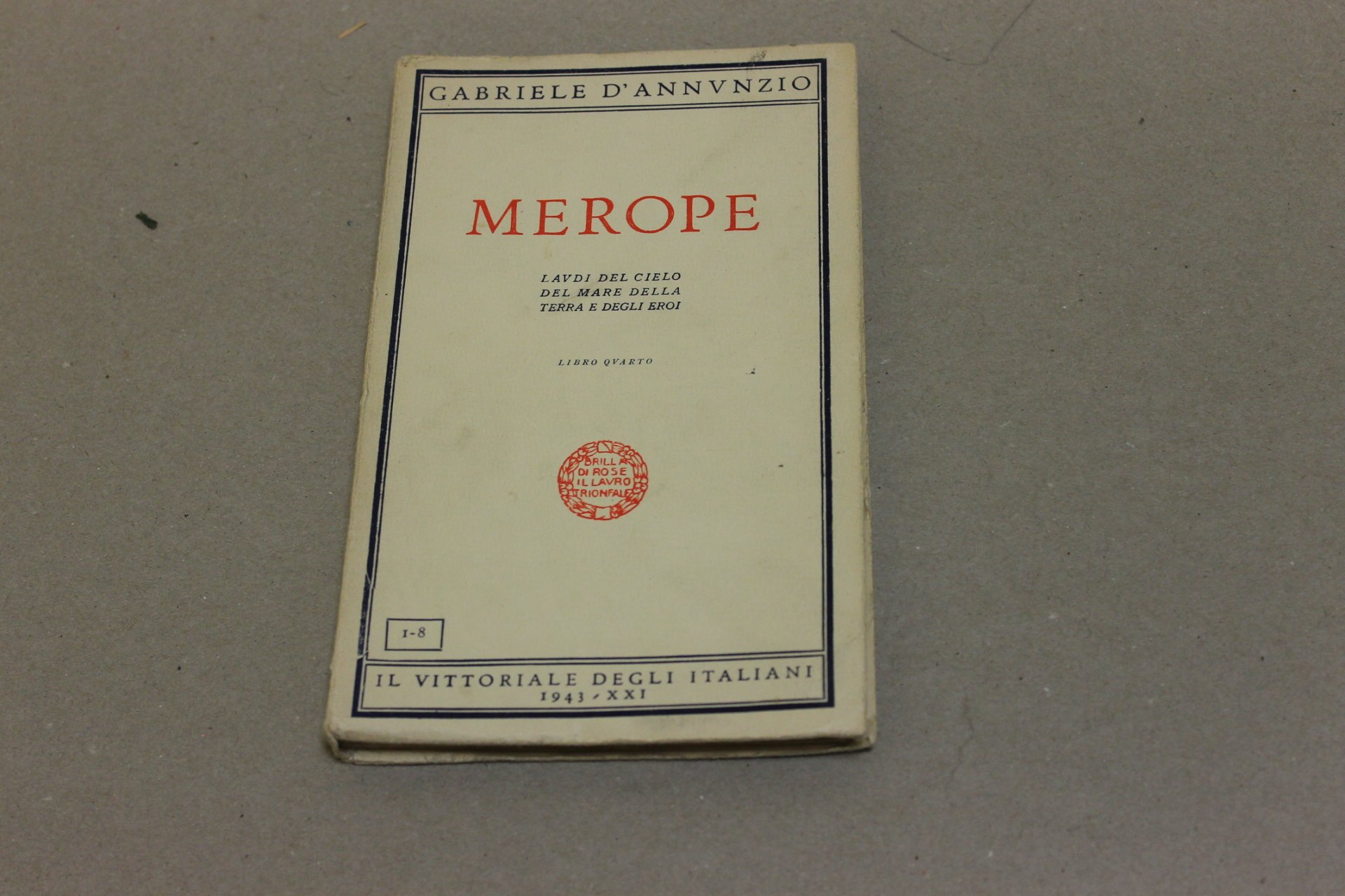 Gabriele d'Annunzio Merope - Laudi del cielo del mare della terra e degli eroi. N.D., Il Vittoriale degli Italiani 1943 italiano, in ottavo pp.155 Cartonato morbido con sovracoperta, pagine da refilare sui tre lati. Libro in ottime condizioni. Pagine e copertina ingiallite dal tempo.