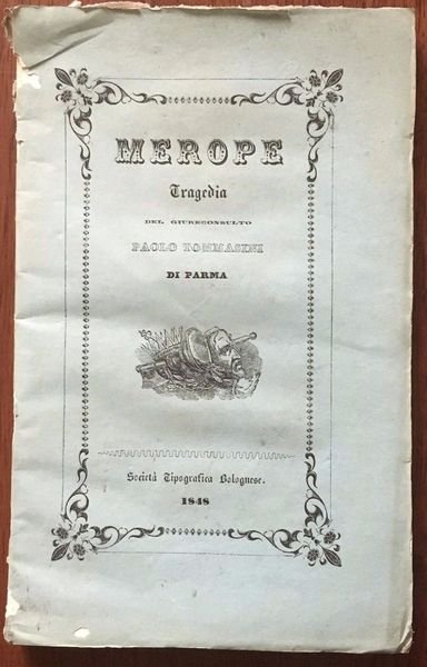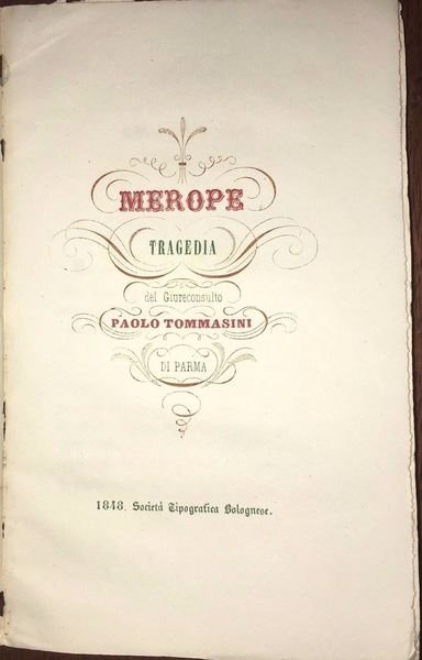 In 8° (18,5x11,5 cm); 111, (1) pp. Brossura editoriale con titolo e fregio, entro ricca cornice al piatto anteriore. Qualche lieve difetto. Bellissimo frontespizio stampato in rosso e verde con arzigogoli viola. Esemplare ancora a fogli chiusi. Prima ed unica rarissima edizione, stampata con curatissima veste grafica dalla Società Tipografica Bolognese che nello stesso 1848 iniziò la sua attività letteraria, di questa tragedia scritta dal giureconsulto parmense, Paolo Tommasini. Lopera forse non venne mai distribuita per ragioni legate al tema dellopera e alla situazione politica italiana del 1848, esiste infatti un solo esemplare censito in ICCU. La storia di Merope è quella della regina messena il cui marito, Cresfonte, e i due figli sono stati assassinati dal suo cognato, Polifonte, che usurpa il potere reale e tenta di forzare la regina a sposarlo. Questa storia della mitologia greca alla quale aveva già attinto Voltaire, era stata ripresa, da Scipione Maffei e Vittorio Alfieri in chiave nazionalistica in quanto era fin troppo semplice per il pubblico vedere in essa l'agognata tragedia nazionale da opporre all'egemonia francese. Anche la curiosa scelta della stampa del titolo in rosso e verde su sfondo bianco sembra richiamare direttamente i moti risorgimentali. Tommasini riprese le due opere di Scipione ed Alfieri, rielaborandole e rendendo i richiami nazionali ancor più espliciti. Opera rarissima ed importante per la storia delleditoria risorgimentale bolognese dellottocento. Rif. Bibl.: IT\ICCU\PAR\1240640.