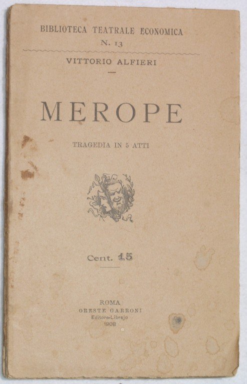In 16. Dim. 17x11 cm. Pp. 47. Edizione del 1908 della serie biblioteca teatrale economica della famosa tragedia scritta da Vittorio Alfieri (1749-1803). Merope fu pubblicato per la prima volta nel 1782. In buone condizioni generali. Brossura editoriale in buone condizioni generali con usure ai margini e dorso. Rare fioriture. Edition of 1908 of the series biblioteca teatrale economica of the famous tragedy written by Vittorio Alfieri (1749-1803). Merope was published for the first time in 1782. In good general conditions. Editorial cover in good general conditions with worn edges and spine. Occasional foxings.