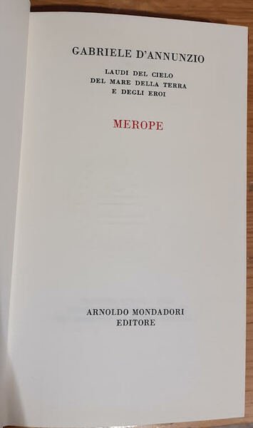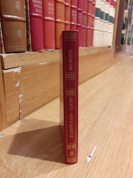 Laudi del cielo del mare della terra e degli eroi. Libro quarto - Merope. Libro complessivamente in buono stato di conservazione. Copertina rigida rossa con decorazioni dorate, presenti anche sulla costa. Pagine in ottime condizioni. Copertina con qualche segno del tempo (vedasi foto).