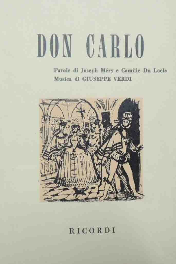 Don Carlo. Opera in cinque atti, parole di Joseph Méry e Camille Du Locle, musica di Giuseppe Verdi (1813-1901), versione ritmica italiana di A. De Lauzières e A. Zanardini, prima rappresentazione: Parigi, Teatro del’Opera, 11 marzo 1867, Ricordi, Milano 1975, rist., pp. 70, cm 15, br. ed. Qualche sgualcitura, minime fioriture, lieve brunitura della carta, per il resto ben conservato.