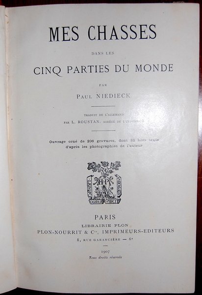 Mes chasses dans les cinq parties du monde par Paul Niedieck, traduit de l'allemand par L. Roustan, agrege' de L'Université. Ouvrage orné de 208 gravures, dont 32 ors texte d'àprès les photographies de l'auteur.