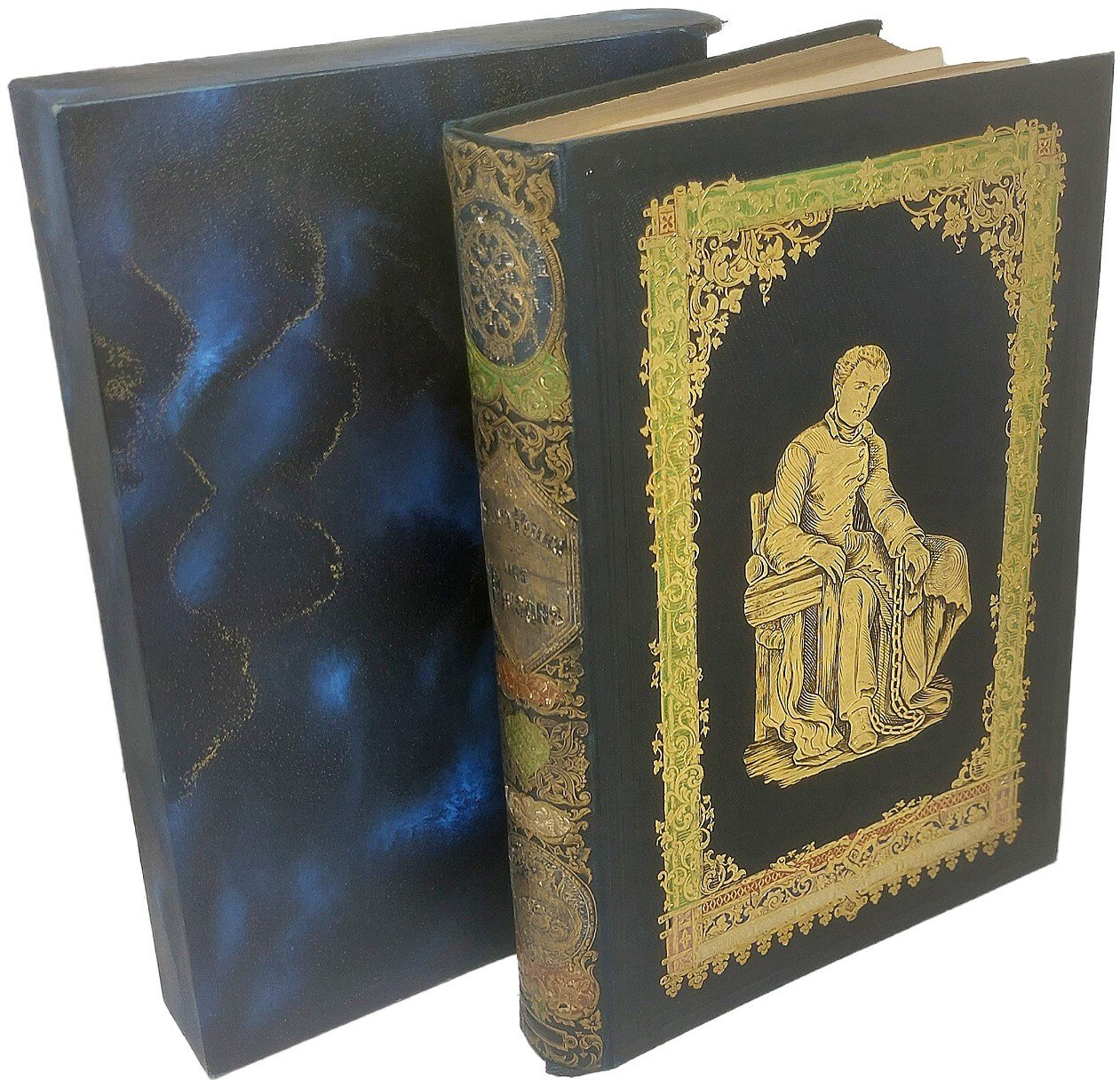 >in-8 grande, pp. XXI, 374, (2), con vignette ed illustrazioni n.t., 25 tavole f.t. protette da velina. Sontuosa legatura originale in piena percallina blu, ricca decorazione in oro e policroma sui piatti e al dorso, figura intera del Pellico incatenato impressa in oro al centro del piatto anteriore, tagli dorati. Astuccio. Stupenda edizione del periodo romantico, ricercata per le belle illustrazioni e la legatura del tempo. Esemplare freschissimo. Parenti n.451.Carteret, III, 458.