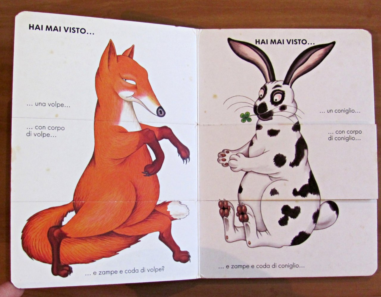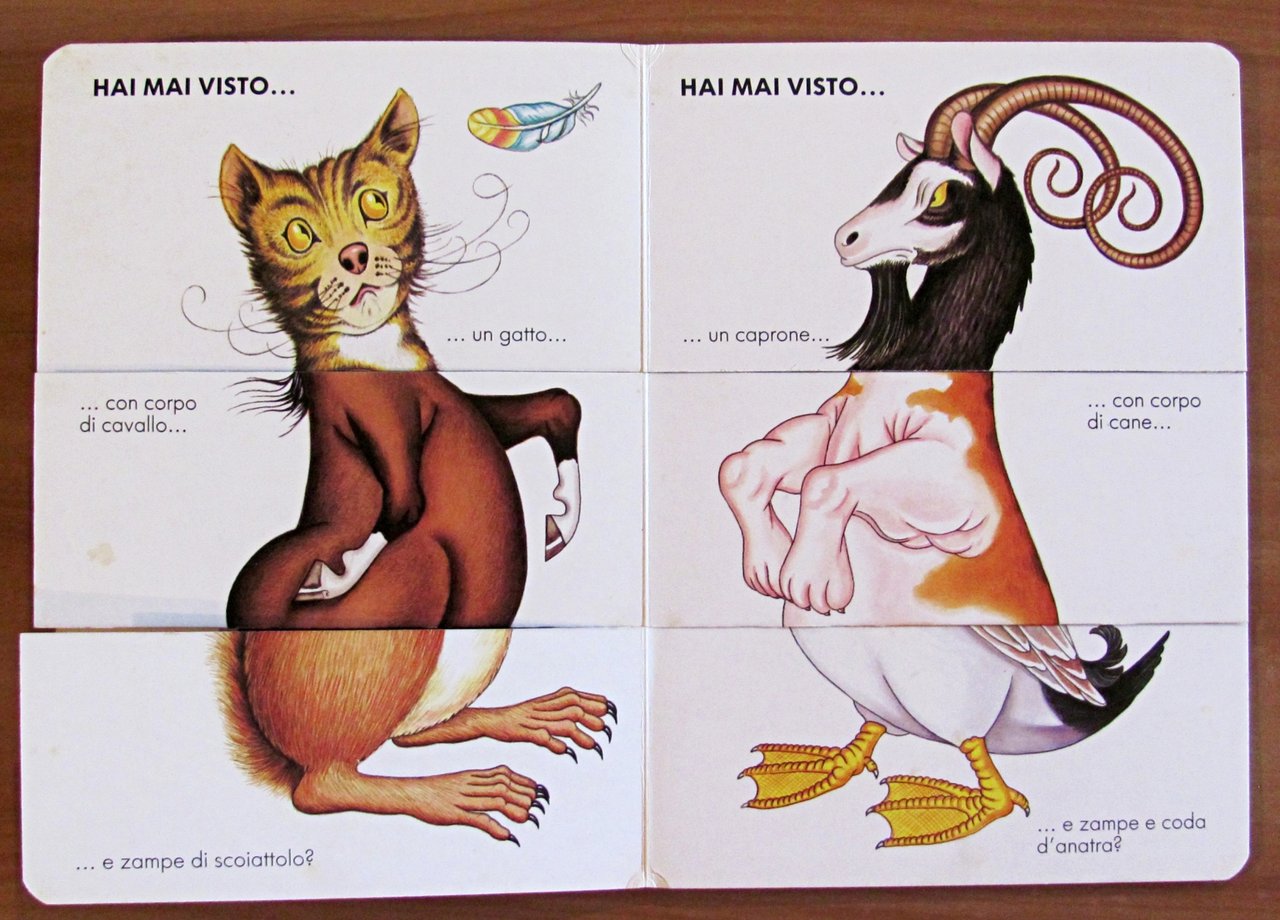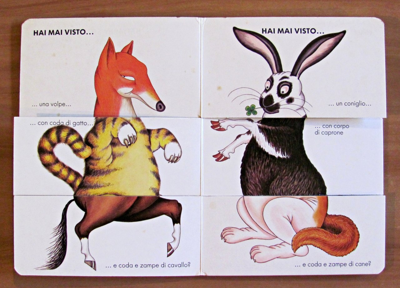 Illustrazioni a colori a tutte le pagine. Ogni pagina è tagliata in 3 parti e girando le varie parti si possono mescolare le figure e crearne di nuove. Si possono ottenere 250 combinazioni. Ed. Orsa Maggiore - Forlì, I edizione 1990. Cartonato editoriale con dorso in tela. 17x24. Stato di Nuovo. , Perfetto (Mint)