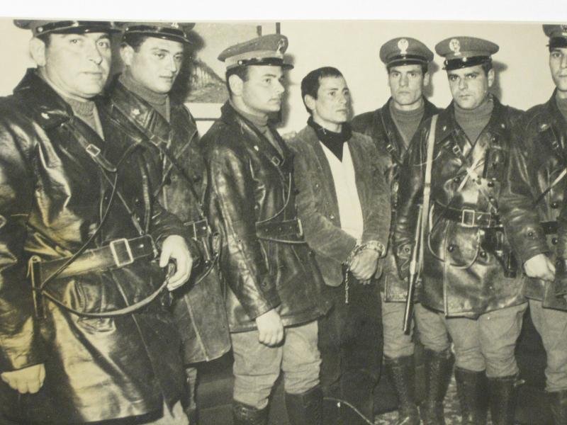 Silver print cm 22 x18. Graziano Mesina nello studio del questore di Nuoro, ammanettato e al centro di due ali di poliziotti in posa. E' il 23 marzo 1968: i giornali e la televisione in bianco e nero celebrano la vittoria sul bandito simbolo di indomita ribellione che ora lancia proclami ai suoi compagni affinche liberino gli ostaggi ancora nelle loro mani. Otto anni dopo fuggira' dal carcere di massima sicurezza di Lecce ridando nuova forza a un mito.