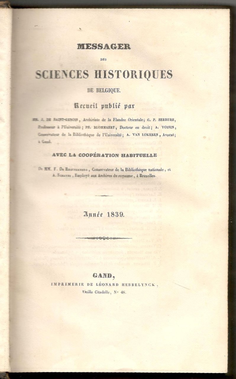 In 8°, pp. 520. Con 12 tavole fuori testo. Mezza pelle dell'epoca con titoli e filetti oro sul dorso. Tagli puntinati azzurri. Fra i vari testi si segnala: SERRURE, J. P. Sur les monnoies frappées à Rummen, par Jean II, sire de Wesemael. - Sur Lucas de Leyde et Christophe de Cologne. - PIOT, C. Notice biographique sur le peintre Verhagen.