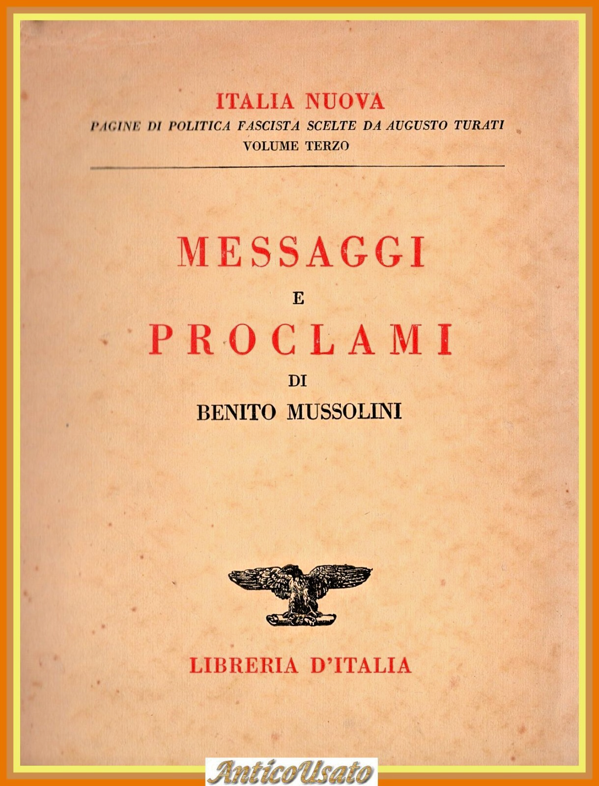 MESSAGGI E PROCLAMI di Benito Mussolini. Libreria d'Italia Editore, 1929. X, 226 pagine. Copertina editoriale in brossura. Stato di conservazione: molto buono (pagine normalmente ingiallite) Libro usato saggistica fascismo