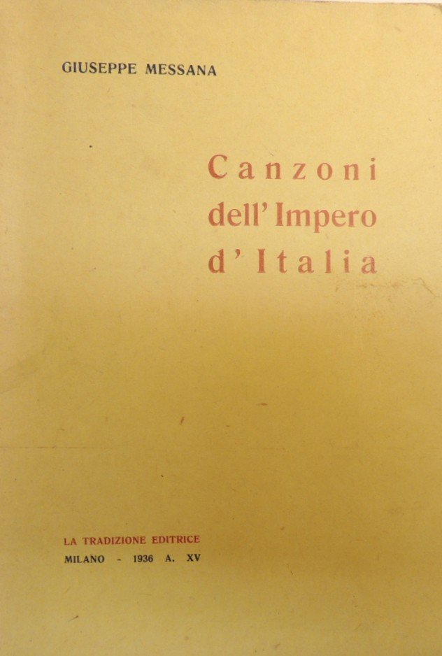 Giuseppe Messana, Canzoni dell’Impero d’Italia, con un saggio critico di Pietro Mignosi, La Tradizione Editrice, Milano 1936, pp. XV, 46, cm 21, br. ed. Minime tracce d’uso alla brossura, una piccola abrasione alla prima di copertina, per il resto molto ben conservato. Estremamente raro.