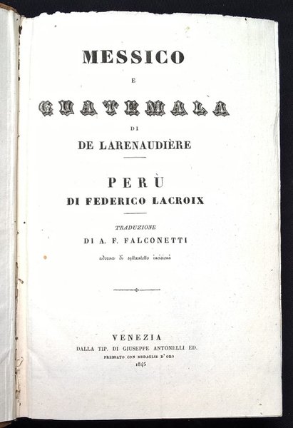 Messico e Guatemala di De Larenaudière. Perù [e Bolivia] di Federico Lacroix. Traduzione di A. F. Falconetti adorna di settantotto incisioni
