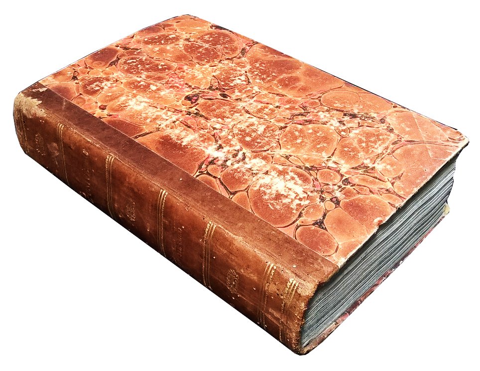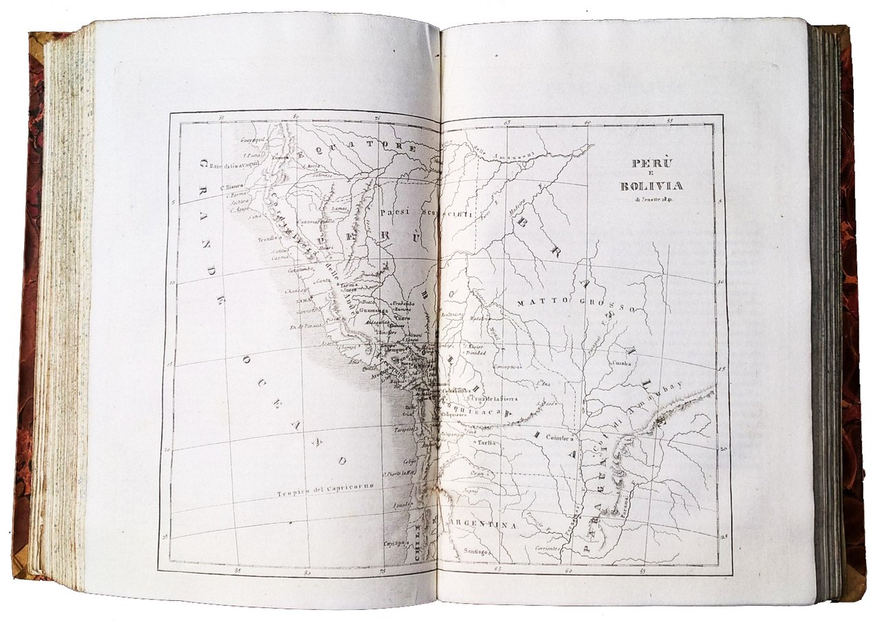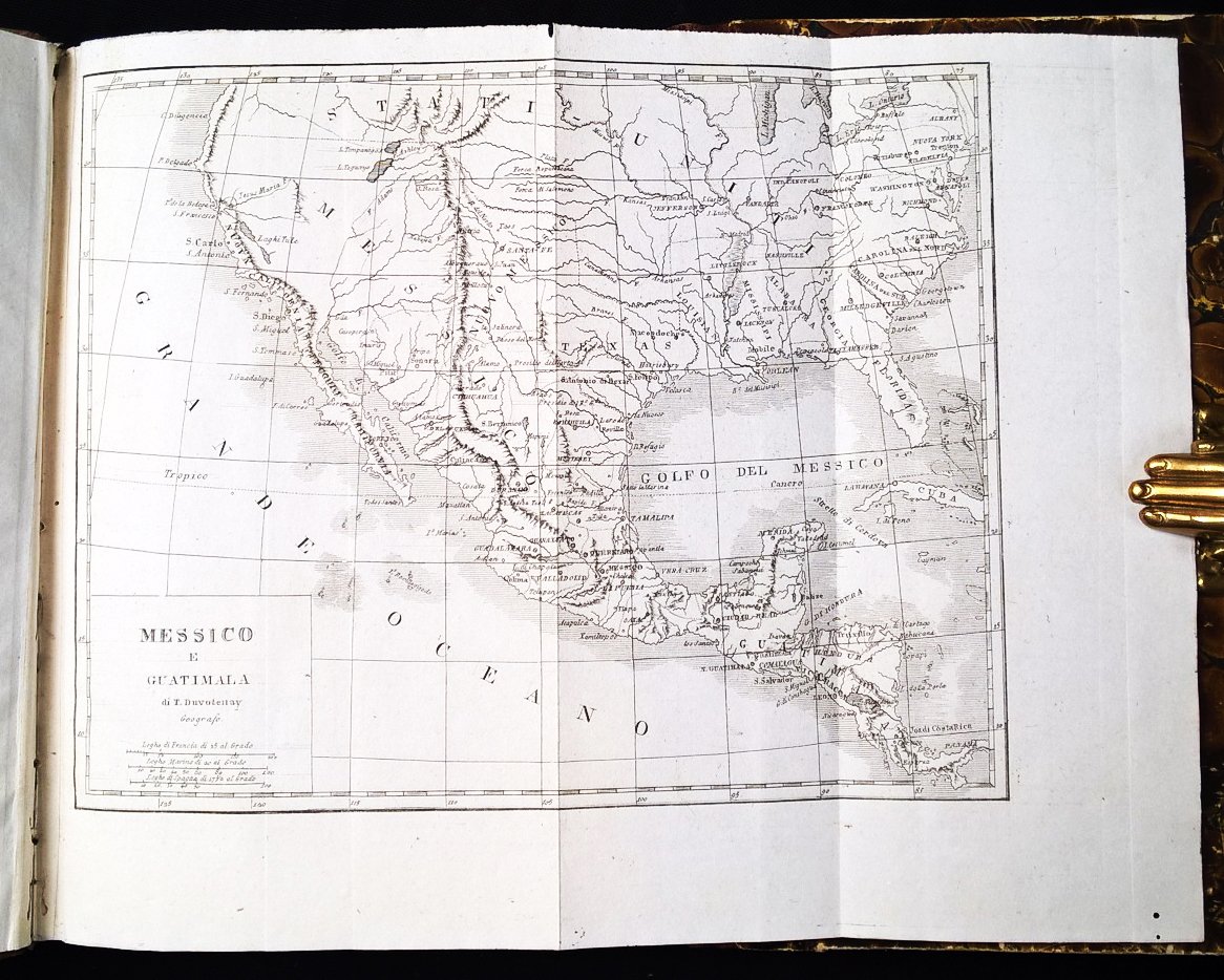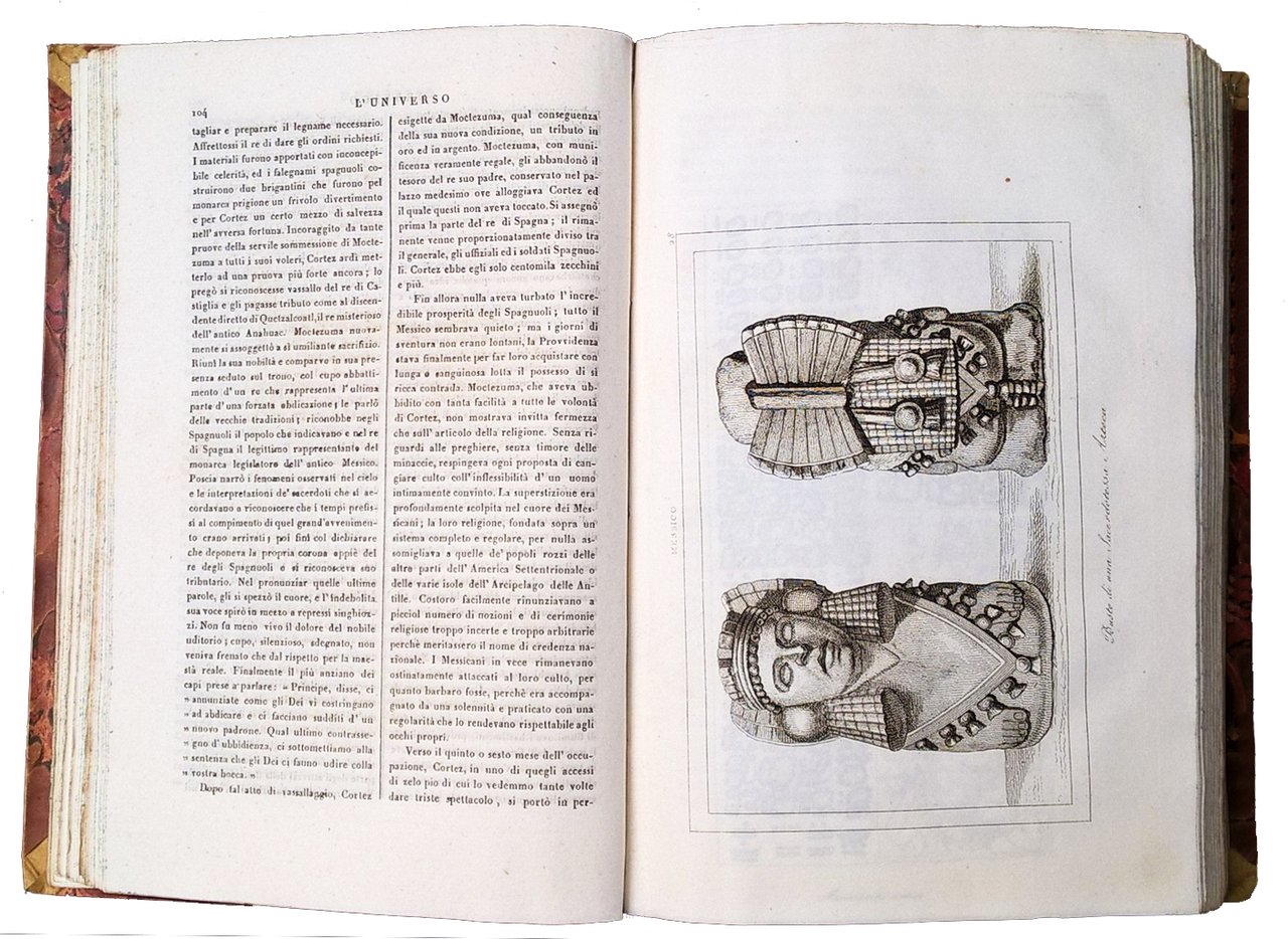 in-8°, 220x152 mm, leg. coeva in mezza pelle e carta marmorizzata ai piatti, titolo e fregi dorati al dorso, tagli colorati di azzurro-verde a spruzzo; pp. 532, [87] c. di tav. alcune ripieg., [2] c. geogr. ripiegate. Testo su due colonne. Numerazione progressiva delle pagine nei due tomi; ripetute per errore tipografico le pp. 401-448 (con relativa nota manoscritta), erroneo calcolo delle incisioni al frontespizio, in realtà il volume comprende 2 cartine geografiche ripiegate (Anahuac – Messico e Guatemala), 50 incisioni a piena pagina per il Messico, 18 per il Guatemala, 1 cartina a doppia pagina Perù e Bolivia e ulteriori 22 incisioni. Prima edizione italiana riccamente illustrata di questo volume dedicato a Messico, Guatemala, Perù e Bolivia, facente parte della collana “L’Universo o storia e descrizione di tutti i popoli, ec. loro religioni, costumi, usanze, ec.” (titolo della collana riportato all'occhietto). Rif.: IT\ICCU\PUV\0682640. OCLC, 962926319. Cond.: Lievi segni d'uso alla leg. (abrasioni alle carte, forellini di tarlo al dorso). Carte fresche, rari fori e camminamenti di tarlo in prossimità della cucitura di alcune carte. Strappo alla parte superiore delle pp. 407-408, con perdita parziale del titoletto sopra il testo; foro alle pp. 435-436; entrambi questi difetti sono ininfluenti, perché si verificano nel gruppo di pagine ripetute due volte. Esemplare in condizioni generali molto buone.