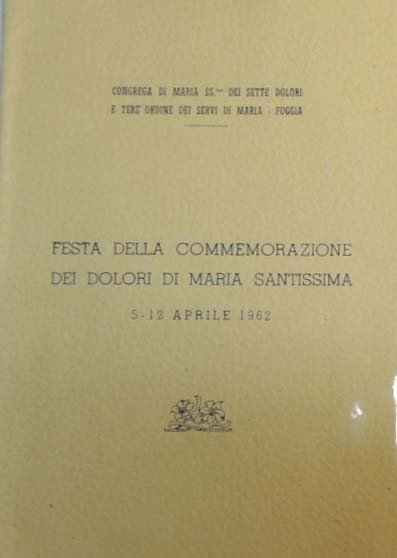 Antonio Messinese, “La Rosa Mistica” in una rugiada di lagrime. Accenni teologici del dolore mariano. Panegirico recitato nel Venerdì di Passione nella Chiesa della Addolorata alla chiusura del Solenne Settenario predicato, s.n., s.l. (ma stampato a Foggia, presso la Tipografia Editrice Arpaja), s.d. (1962?), pp. 19, ill. b.n., cm 24, opuscolo spillato. Intestazione in prima di copertina: Congrega di Maria SS.ma dei Sette Dolori e Terz’Ordine dei Servi di Maria – Foggia, Festa della commemorazione dei dolori di Maria Santissima 5-12 aprile 1962. Prezzo depennato alla quarta di copertina, per il resto perfetto. Estremamente raro.