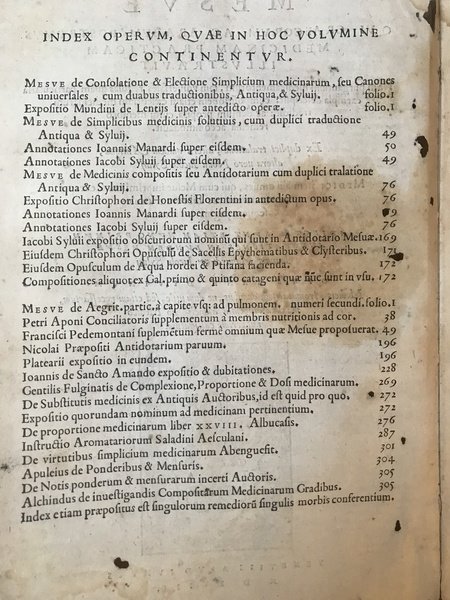 Mesue qui Graecorum ac Arabum postremus medicinam practicam illustrauit. Nam purgantium medicamentorum, tam vniuersales regulas quàm particularia exempla descripsit compositionem etiam cælebrium medicinarum tradidit: ac demum propria cuique membro remedia accomodauit. Ex duplici tralatione, altera quidem antiqua, altera uero noua Iacobi Syluij . Adiectae sunt etiam nunc primum annotationes . Ioannis Manardi et Iacobi Syluij .