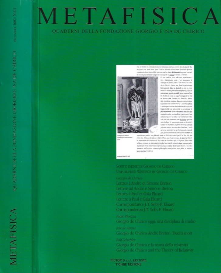 Metafisica - Quaderni della Fondazione Giorgio e Isa De Chirico, n. 1-2, dicembre 2002. Corposa brossura filo refe, leggermente viziata da compressione, copertina illustrata da composizione grafica, toni alterati da leggere velature evidenti in quarta, patinato segnata da minime tracce e graffietti di manipolazione, interno in ottimo stato, invitano alla lettura e si sfogliano con piacere le carte avorio, un poco ossidate ai margini, pulviscolo bruno ai tagli. N. pag. 400