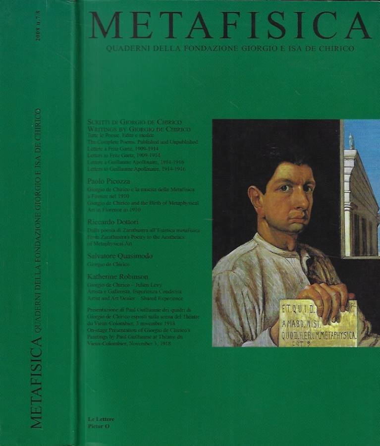 Metafisica - Quaderni della Fondazione Giorgio e Isa De Chirico, n. 7-8, anno 2008. Massiccia brossura filo refe, viziata da compressione, copertina illustrata da composizione grafica, toni impastati dal tempo, appesantiti da leggere ma evidenti ombre di polvere, segnata da tracce di manipolazione, bordo stanco con minime abrasioni, interno in ottimo stato, invitano alla lettura e si sfogliano con piacere le carte avorio, un minimo ossidate ai margini, ombre brune ai tagli. N. pag. 758