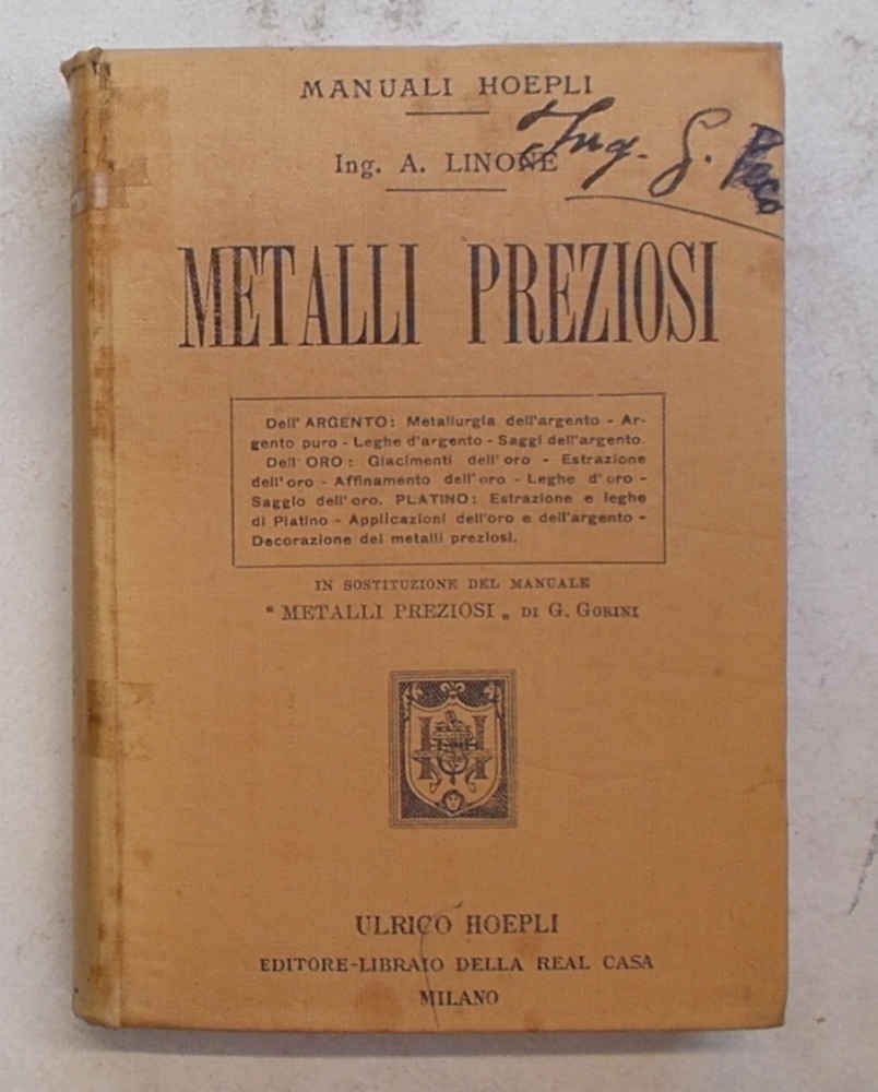 In 16° (cm. 15 x 10,5); pagg. XI, 315; con alcune illustraz. n.t.; tela originale con titoli impressi; tagli rossi. Firma in copertina e timbro al frontespizio, ma buono e solido. VG-. ** Prima edizione. Sostituisce il "Metalli preziosi" di G. Gorini.