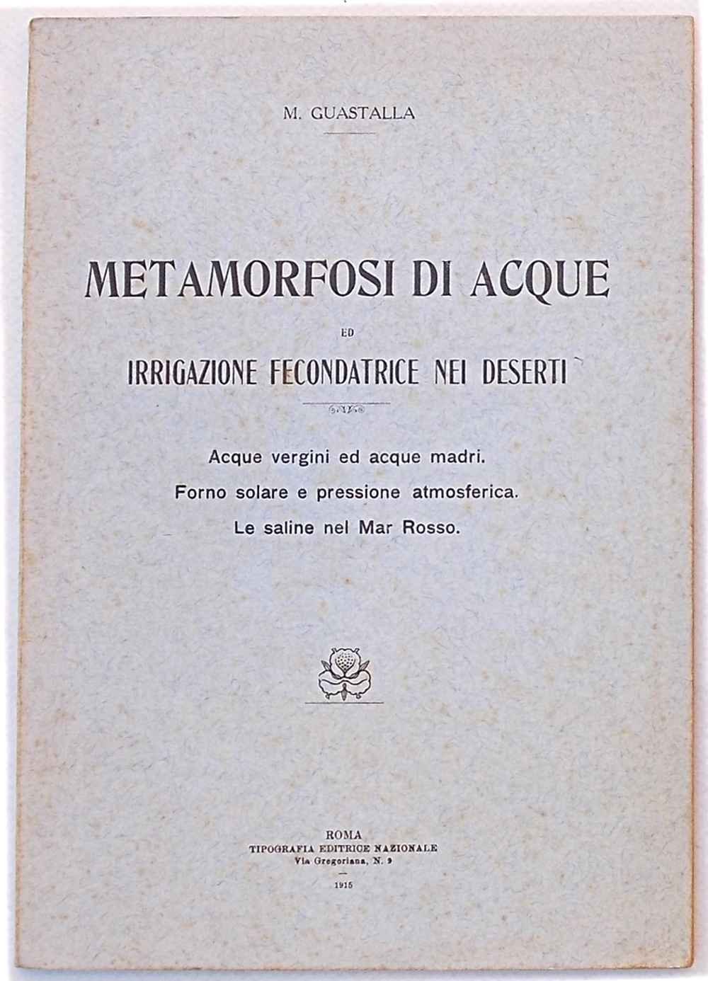 In 8° (cm. 24 x 17); pagg. 71; con 3 illustrazioni n.t.; leggera cartonatura originale. VG. ** L'Autore illustra un nuovo sistema con forno solare per potabilizzare l'acqua di mare e per rendere più efficente la produzione delle saline. Con note sulle saline del Mar Rosso (Aden, Porto Said, Massaua) e sulle slaine italiane.