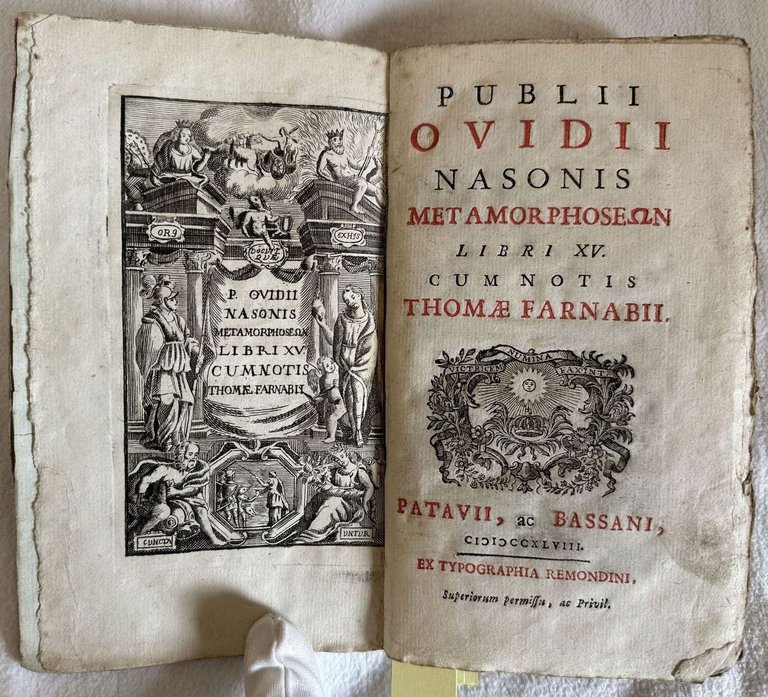 In 16. Dim. 16,5x9,5 cm. Pp. 500+(4). Edizione Remondini del 1748 della famosa opera del poeta romano Publio Ovidio Nasone (43 a.c.-18 d.c.). L'opera "Metamorphoseon" Ë un poema epico mitologico in quindici libri incentarto sul fenomeno delle metamorfosi. Attraverso l'opera Ovidio ha reso celebri e trasmesso ai posteri numerosissime storie e racconti mitologici dell'antichità greca e romana. Testo latino con note di Thomas Farnaby (1575-1647). Antiporta illustrata. Frontespiizio in rosso e nero. in barbe. Le pagine dalla 457 alla 480 mancanti. In buone condizioni. Copertina cartonata decorata coeva con titolo al dorso in buone condizioni generali con lievi usure ai margini e dorso. Alcune decorazioni della coperta sono state colorate. Legatura in buone condizioni. All'interno le pagine si presentano in buone condizioni con rare fioriture.Remondini edition of 1748 of the famous work by the roman poet Publio Ovidio Nasone (43 a.c.-18 d.c.). The work "Metamorphoseon" is a mythological epic poem in fifteen books about the phenomena of metamorphosis. Ovidio thanks to this work made famous and transmitted many mythological histories and tales of roman and greek antiquities. Latin text with notes by Thomas Farnaby (1575-1647). Illustrated frontspice. Red and black frontspice Uncut copy. Pages from 457 to 480 lack. In good conditions. Carton decorated coeval cover with title in the spine in good conditions lightly worn in the extremities. Some decorations of the cover has been coloured. Binding in good conditions. Pages in good conditions with occasional foxing. In 16. Dim. 16,5x9,5 cm. Pp. 500+(4). <BR><BR>
