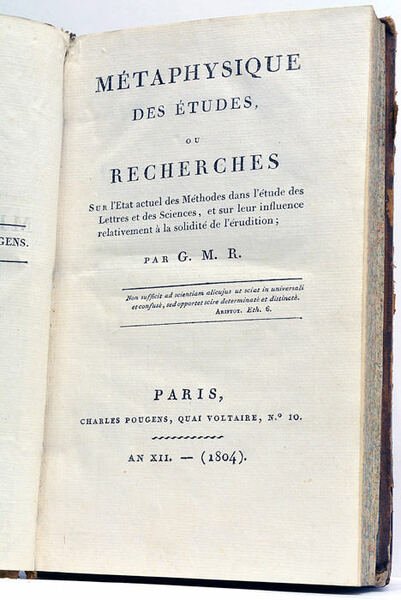 Métaphysique des Etudes, ou Recherches sur l’état actuel des Méthodes dans l’étude des Lettres et des Sciences, et sur leur influence relativement à la solidité de l’érudition. Par G. M. R.