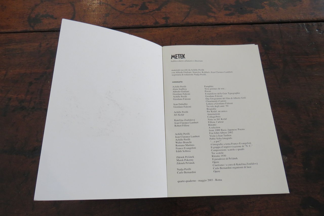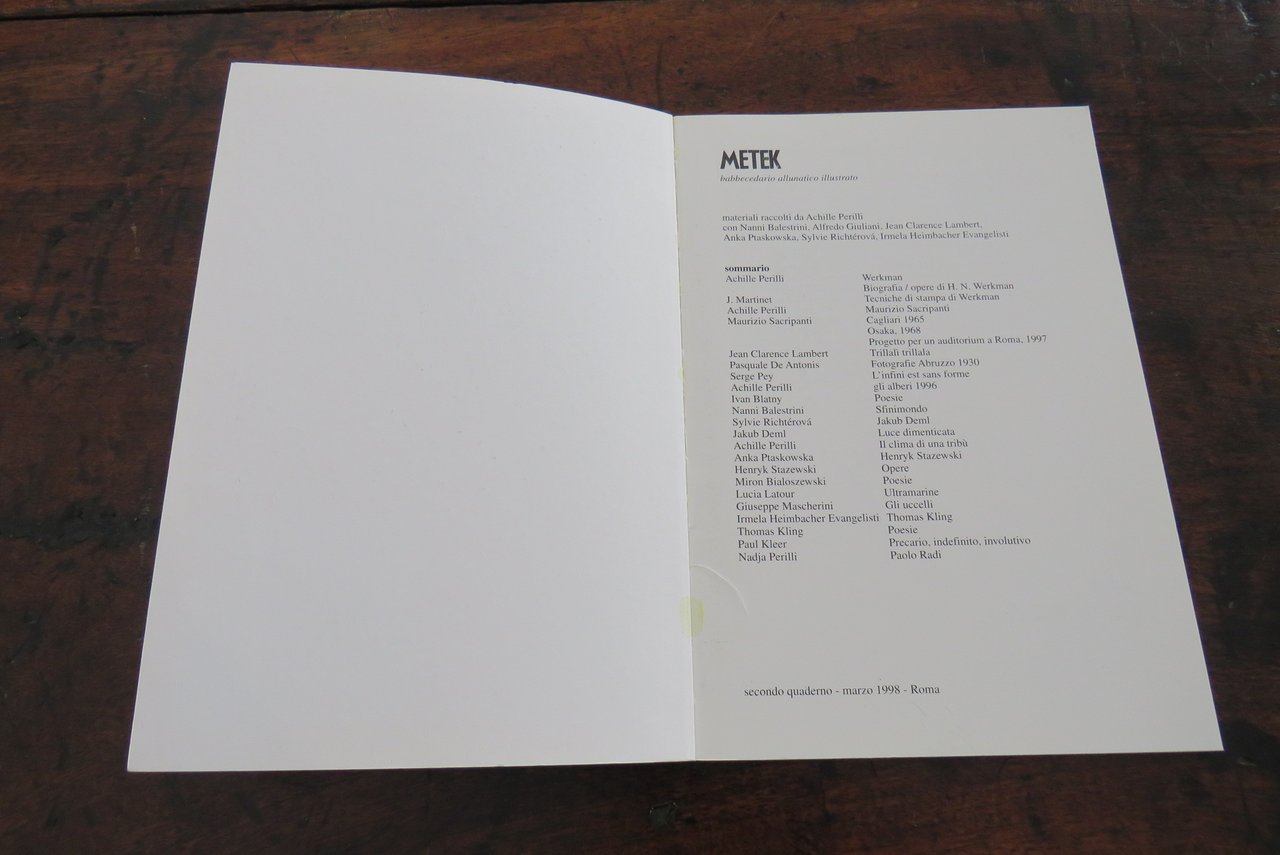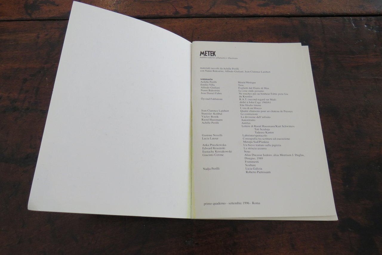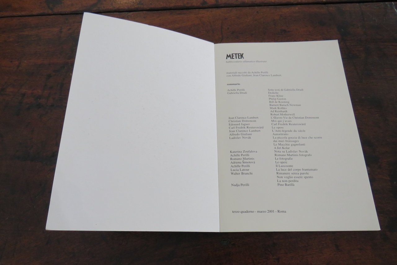 Roma, Edizioni De Luca, 1996,1998, 2001, 2003. In -8 (mm. 160,5x230,8), pp. 64, 64, 64, 64, con numerose illustrazioni in nero nel testo. Brossure editoriali originali tipografiche, di colore azzurro, rosso, verde e viola. Primo Quaderno. Settembre 1996. Secondo Quaderno. Marzo 1998. Terzo Quaderno. Aprile 2001. Quarto Quaderno. Maggio 2003. 4 numeri. Tutto il pubblicato. Materiali raccolti da Achille Perilli, con Nanni Balestrini, Alfredo Giuliani, Jean Clarence Lambert. All’interno di ciascuna brossura testi di diversi autori. Ottimo.