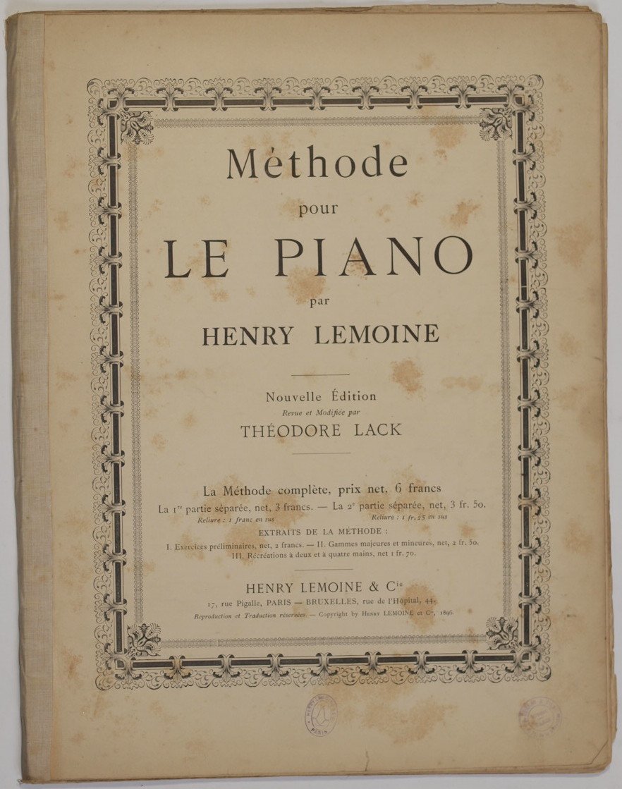 In 4. Dim. 35x27,5 cm. Pp. 61. Edizione del 1903 di questo manuale per lo studio del pianoforte di Henry Lemoine, nuova edizione rivista e modificata da Theodore Lack. Bella brossura editoriale illustrata. In mediocri condizioni. Brossura editoriale in mediocri condizioni generali con usure e parti mancanti ai margini e dorso; dorso in tela. Legatura in discrete condizioni con rotture. All'interno le pagine si presentano in buone condizioni con rare fioriture.