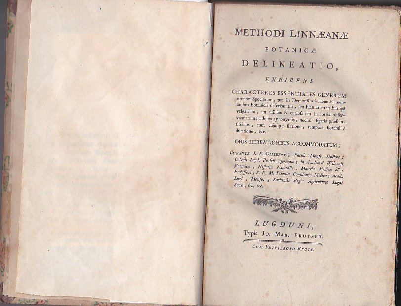 In-8° (218x139mm), pp.XXIV, 482, legatura ottocentesca m. tela con titolo e decori a catenella in oro al dorso. Piatti in cartone marmorizzato con decoro a fogliame in rosso e in verde. 3 tavv. incise su rame f.t. in fine, di cui 2 ripiegate. In barbe, con qualche ingiallitura e fioritura. La numerazione delle tav. è IX-XI, ma le schede degli esemplari commercializzati in precedenza o censiti in biblioteche pubbliche discorrono appunto di sole 3 tavole, dato che conferma la completezza dell'esemplare. Edizione originale di questo studio di fitoclassificazione secondo l'ordinamento linneiano. Il Gilibert (Lione, 1741-ivi, 1814), medico e naturalista, fu professore di scienze naturali in diverse università polacche (su consiglio e segnalazione di Haller) e poi alla Scuola Centrale del Dipartimento del Rodano, Presidente della Società di Agricoltura lionese, Segretario perpetuo della Società di Medicina, membro di numerose società mediche ed agricole, tra cui l'Athénée della sua città natale, nella quale ricoprì anche la carica di sindaco. Presidente della Commissione Dipartimentale durante l'assedio di Lione, nel corso di esso fu dapprima incarcerato (lui, girondino, era ovviamente osteggiato dai montagnardi) e poi liberato nel maggio 1793, divenendo Presidente della Commissione di Salute Pubblica e animando strenuamente la resistenza lionese a Robespierre e alle armate montagnarde. Obbligato alla fuga e all'esilio errabondo, condusse una serie di inenarrabili peregrinazioni che solo dopo 18 mesi lo resero al luogo natio. I suoi scritti a stampa spaziano dalla medicina (in cui incessantemente sostenne la bontà e superiorità dei rimedi naturali) alla zoologia alla botanica (in quest'àmbito lasciò tra l'altro una sistematica classificazione della flora della Lituania). Soulsby, 735. Hancock Natural History Collection, G-8. Manca al Nissen e al Pritzel. Cfr. E. Sainte-Marie, Éloge historique de M. J. E. Gilibert, Lione, 1814.