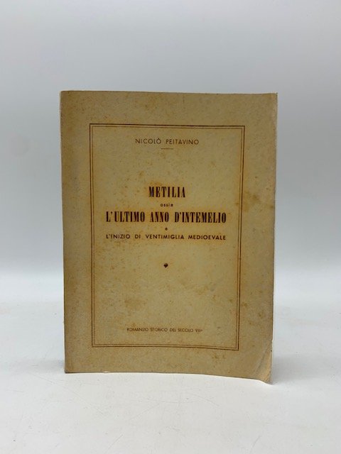 In 8 (cm 15,5 x 21), pp. 174 + (6). Brossura editoriale con protezione plastificata applicata ai piatti. Romanzo storico scritto da Nicolo' Peitavino che racconta la distruzione dell'antica Intemelio e la nascita della cittadina di Ventimiglia.
